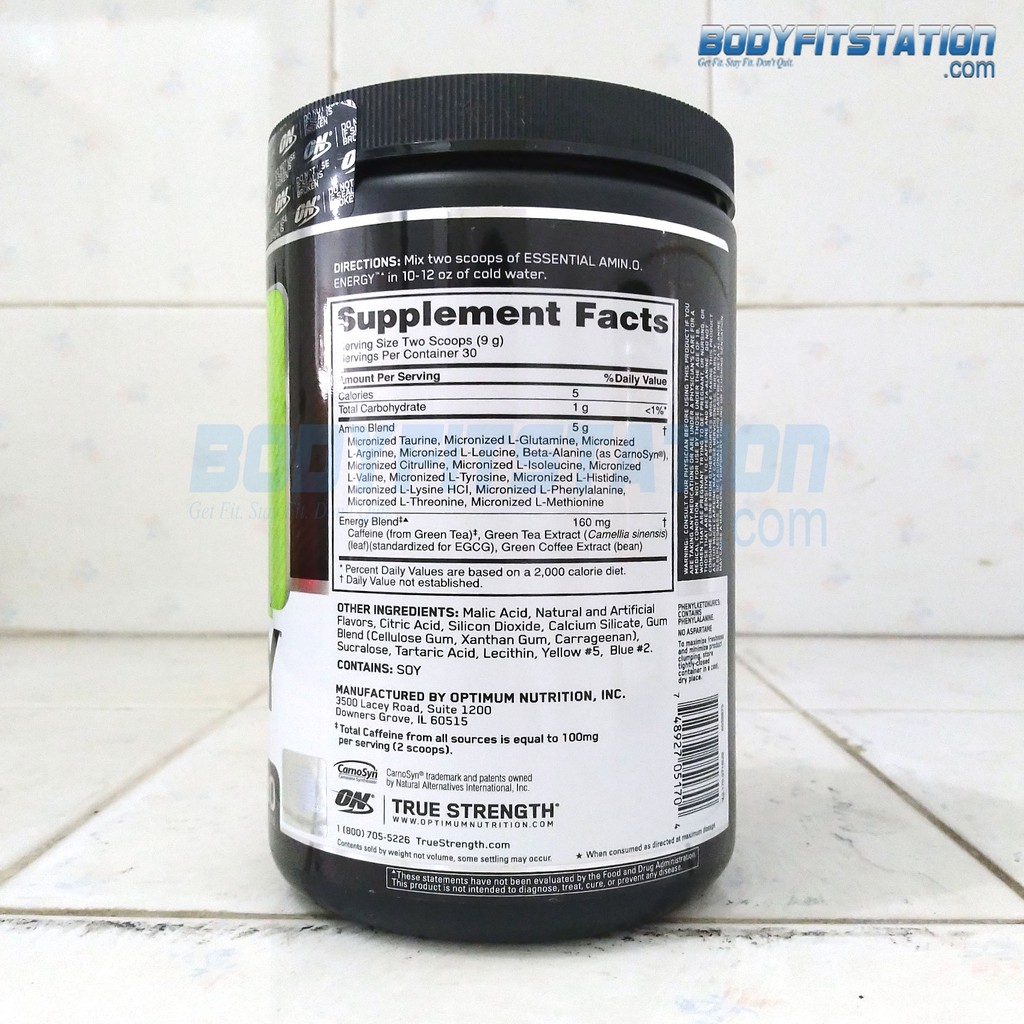 Optimum Nutrition Essential Amino Energy Blue Raspberry - H-E-B Other Ingredients: Citric Acid, Natural & Artificial Flavors, Malic Acid, Tartaric Acid, Silicon Dioxide, Calcium Silicate, Sucralose, Gum Blend (Cellulose Gum, ... Amino Energy Nutrition Facts - Eat This Much Calories, carbs, fat, protein, fiber, cholesterol, and more for Amino Energy ( Optimum Nutrition). Want to use it in a meal plan? Head to the diet generator ... ESSENTIAL AMIN.O. ENERGY | Optimum Nutrition US 100 mg of Caffeine per Serving from Coffee Bean and/or Tea Leaf. 5 Grams of Amino Acids for Muscle Recovery Support. 5 to 10 Calories Per Serving with Zero ...