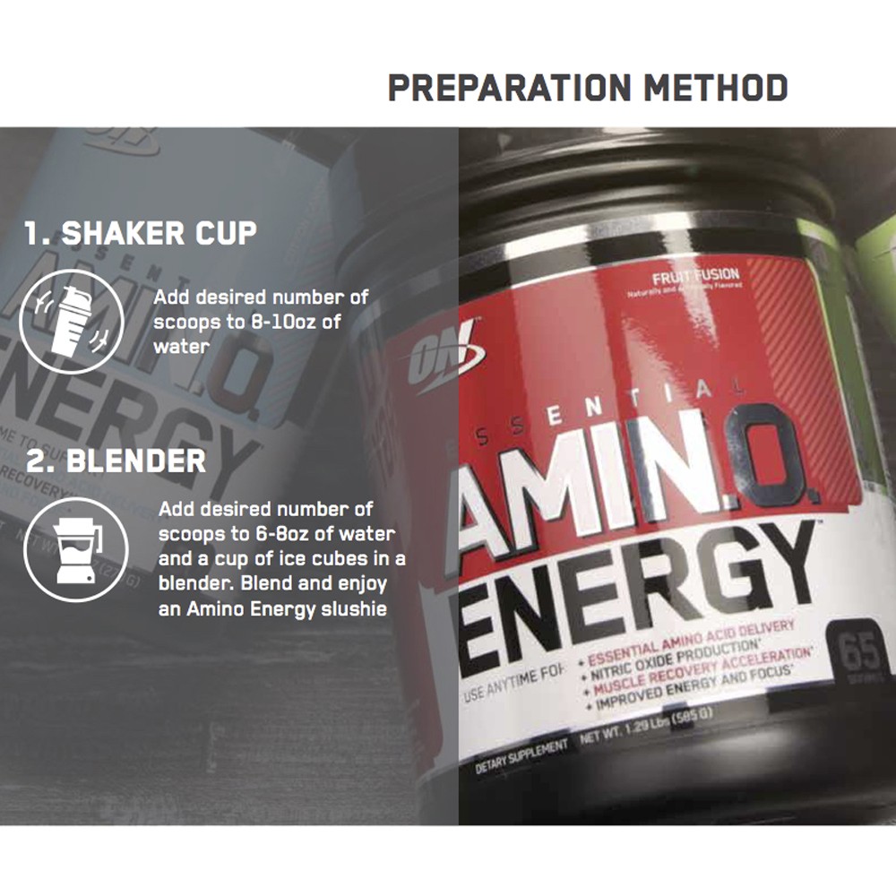 ESSENTIAL AMIN.O. ENERGY | Optimum Nutrition US 100 mg of Caffeine per Serving from Coffee Bean and/or Tea Leaf. 5 Grams of Amino Acids for Muscle Recovery Support. 5 to 10 Calories Per Serving with Zero ... Amino Energy Nutrition Facts - Eat This Much Calories, carbs, fat, protein, fiber, cholesterol, and more for Amino Energy ( Optimum Nutrition). Want to use it in a meal plan? Head to the diet generator ... Optimum Nutrition Essential Amino Energy Blue Raspberry - H-E-B Other Ingredients: Citric Acid, Natural & Artificial Flavors, Malic Acid, Tartaric Acid, Silicon Dioxide, Calcium Silicate, Sucralose, Gum Blend (Cellulose Gum, ...