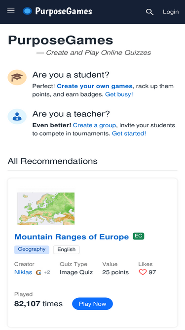 Ireland Mountains Quiz - PurposeGames.com Web22.02.2022 · PurposeGames lets you create and play games. Students, teachers and rockstars alike all come here to create and learn. Give it a try! Students, teachers and rockstars alike all come here to create and learn. Leg muscle labeling Quiz - PurposeGames.com Feb 22, 2022 · Leg anatomy labeling This online quiz is called Leg muscle labeling. It was created by member krevak and has 10 questions. PurposeGames — Create and Play Online Quizzes WebFree online quizzes for anyone and everyone to play. Create your own quizzes, and share it with friends, students, and colleagues. Create and play PurposeGames to learn. Countries of Europe Quiz - PurposeGames.com Web22.12.2022 · Can you find the European countries on a map? Click on the countries that are generally considered to be part of Europe. Learn all the countries of Europe by taking this geography quiz. Just click on